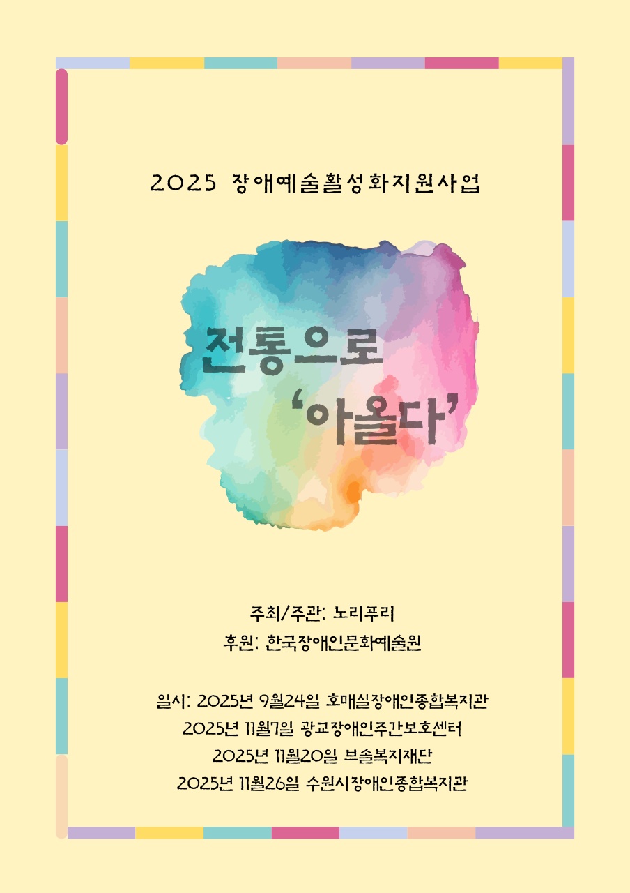 2025 Àå¾Ö¿¹¼ú Ȱ¼ºÈ»ç¾÷À¸·Î ³ë¸®Çª¸®°¡ ÁÖÃÖÁÖ°üÇϰí Çѱ¹Àå¾ÖÀι®È¿¹¼ú¿øÀÇ ÈÄ¿ø°ú ÆÈ»ê´ë ±è¿îż±»ý´Ô°ú ´Ü¿øºÐµé°ú Çù¾÷ÇÑ »ç¹°³îÀÌ °ø¿¬.ÃÑ4ȸÁß 4ȸ° °ø¿¬À» ¼ö¿ø½ÃÀå¾ÖÀκ¹Áö°ü¿¡¼ ÀÌ·ç¾îÁ³´Ù. 4ȸÀÇ °ø¿¬À» ÇÏ¸é¼ È¿Âù, ±¤·¡µµ ¸¹ÀÌ ÁÁ¾Ò³ªº¸´Ù. ³»³â¿¡µµ ºË±â¸¦ ¹Ù¶ó´Â ¸¶À½À» ÀüÇÏ´õ¶ó±¸¿ä. ¼ÒÁßÇÑ ½Ã°£À̾ú½À´Ï´Ù.